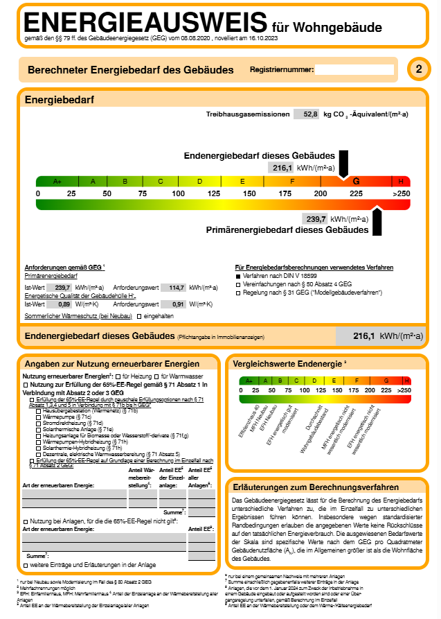 Grundlage ist eine technische Analyse des Gebäudes (z. B. Dämmstandard, Fenster, Heizungsanlage). Dadurch sind die Werte objektiver als beim Verbrauchsausweis.